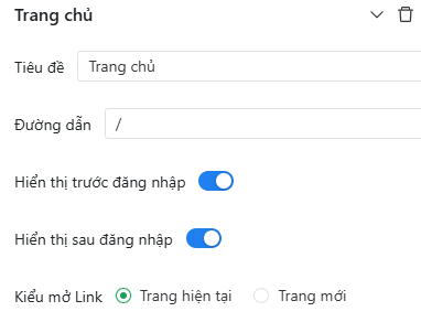 Chọn menu Trang chủ, nhập tiêu đề, chọn cách hiển thị và kiểu mở link.