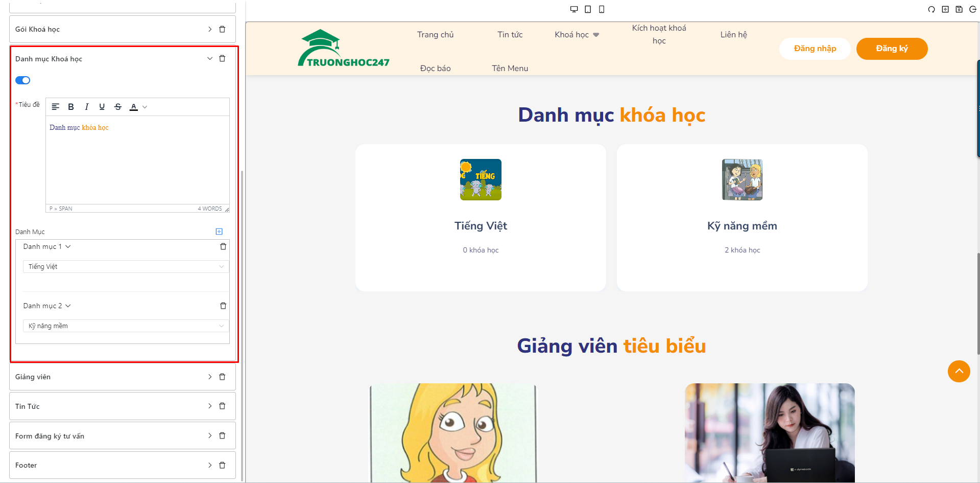 Chọn section Danh mục khóa học, nhập tiêu đề và chọn danh mục khóa học tương ứng trên landing page.