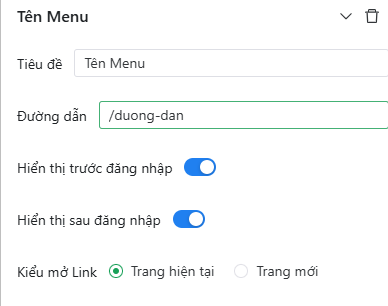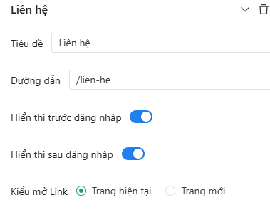 Chọn menu Đăng nhập, nhập tiêu đề, đường dân, chọn cách hiển thị và kiểu mở link.