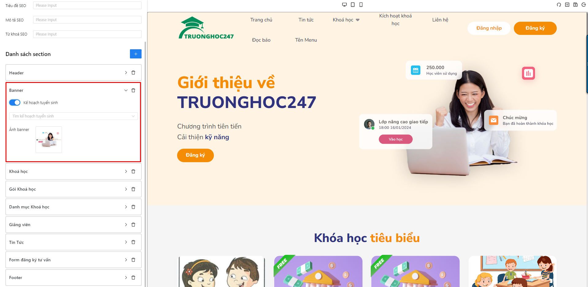 Chọn section banner, cài đặt kế hoạch tuyển sinh hoặc cài đặt banner .