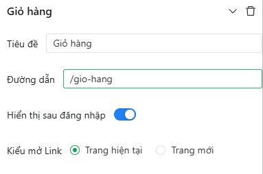 Chọn menu Giỏ hàng, nhập tiêu đề, đường dân, chọn cách hiển thị và kiểu mở link.