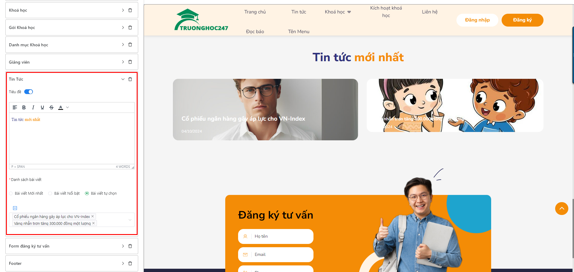 Chọn section Tin tức, nhập tiêu đề và chọn tin tức hiển thị trên landing page.