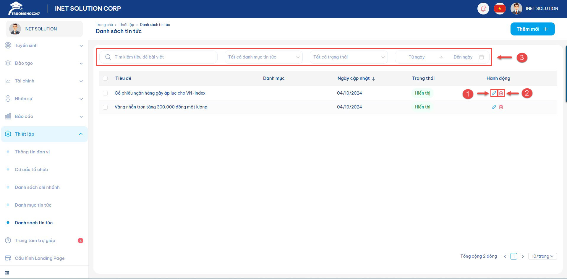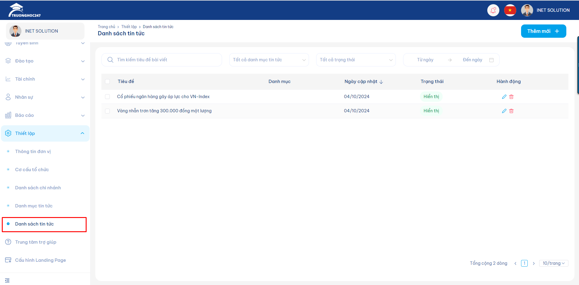 Tại cột menu bên trái, Quản lý click "Thiết lập → Danh sách tin tức" sẽ hiển thị màn hình danh sách tin tức của đơn vị.